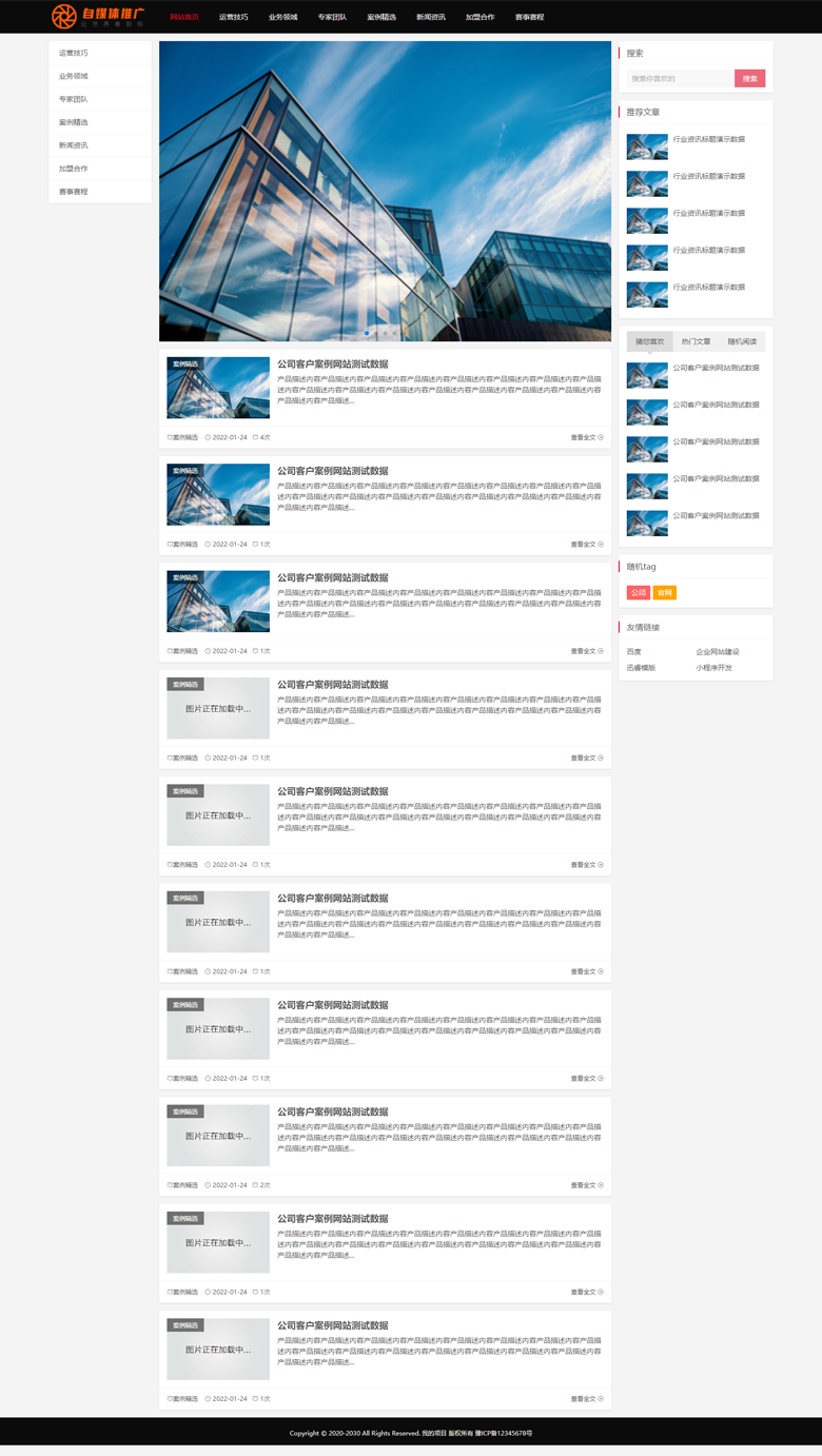 页面左侧浮动显示一级栏目,右侧返回头部按钮,页面简洁大气,无多余代码和元素模块。适合各类网站使用