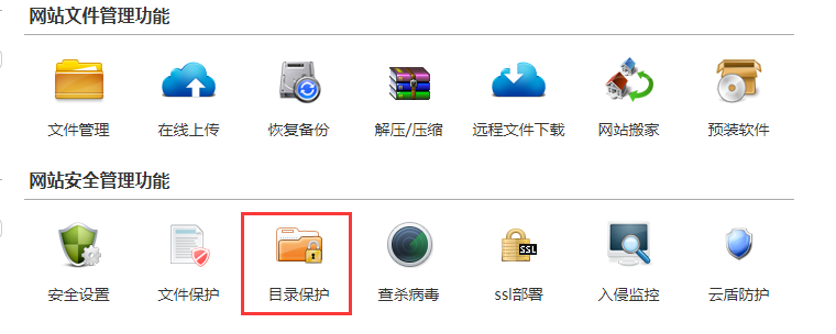 3、在虚拟主机控制面板,点击 目录保护,依次 将 /static 、/skin 、/template 、/uploads 、/apps 、/core 、/runtime 设置文件保护 ;