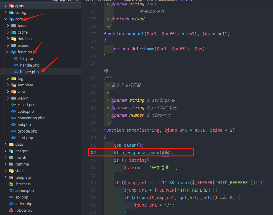 可以在/core/function/helper.php搜索http_response_code(404);。将其改成//http_response_code(404);